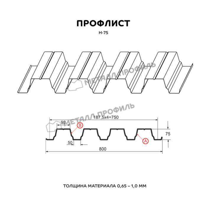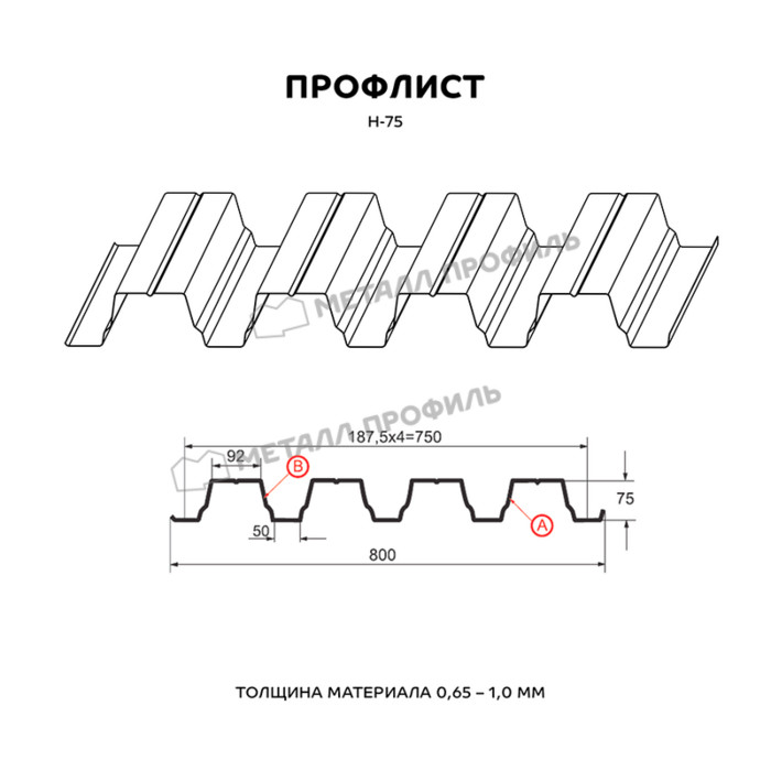Предлагаем купить профилированный лист Н-75 в Волоколамске. Он является оцинкованным стальным материалом, имеющим покрытие. Толщина стальной основы с защитным покрытием составляет 0.8 мм. После проката на специализированном оборудовании лист приобретает рисунок из повторяющихся волн, что значительно увеличивает его жесткость по сравнению с плоским материалом.